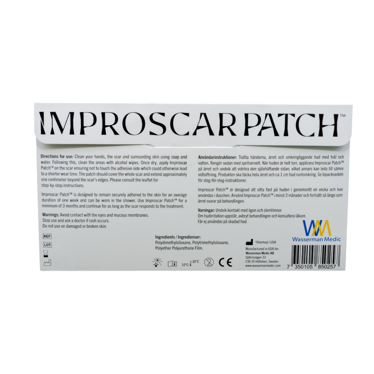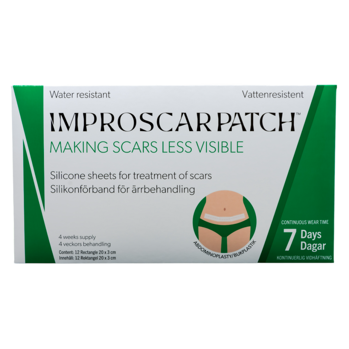 Improscar Patch Abdominoplasty este un plasture din silicon rezistent la apa, folosit pentru a reduce vizibilitatea cicatricilor estetice dupa o operatie de abdominoplastie sau tummy tuck. Fiecare Improscar Patch ramane aplicat pe cicatrice aproximativ o saptamana si poate fi purtat si la dus. Improscar Patch Abdominoplasty contine plasturii necesari pentru a reduce vizibilitatea cicatricilor ce apar in urma unei astfel de interventii.