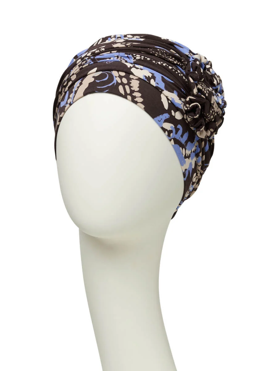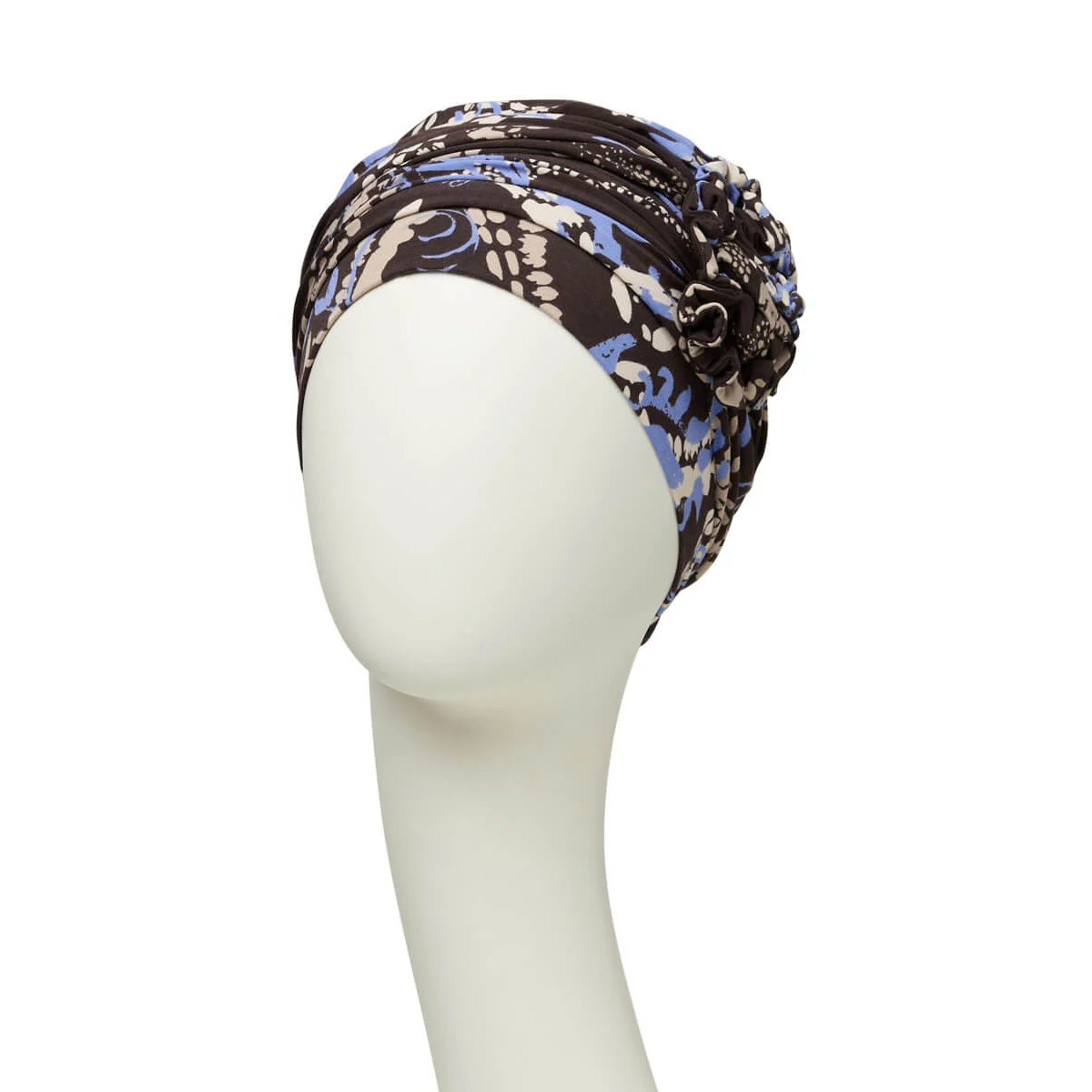 Clasic si elegant, turbanul Lotus este ideal atat pentru un aspect sportiv, cat si pentru un aspect modern si stilat. Il regasim intr-un print de sezon, cu o baza de ciocolata neagra si decorat cu un imprimeu grafic, in forma de romb, in nuante de bej si crem. Efectul este completat de floarea eleganta de lotus montata pe partea laterala si pliurile decorative.