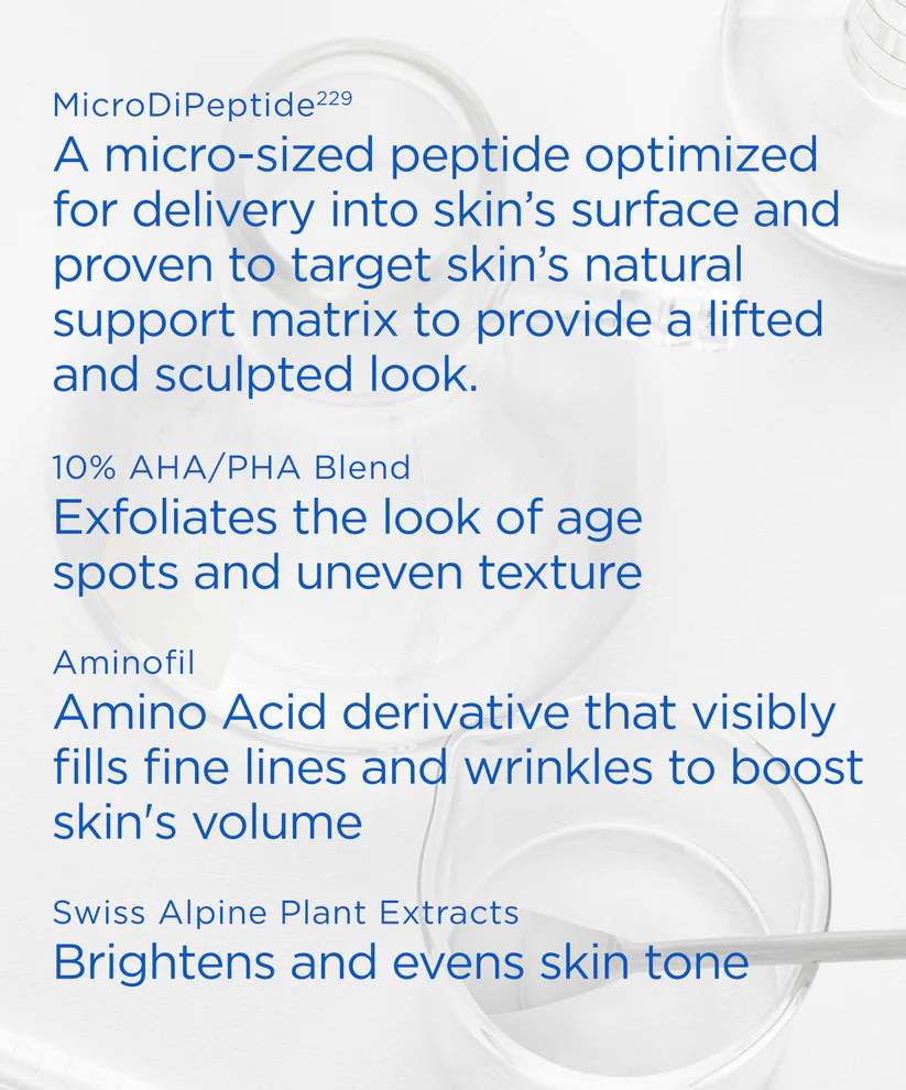 - MicroDiPeptide229 (peptide unică micronizată ce se absoarbe în straturile de suprafață ale epidermului țintind 5 componente cheie ale matricei pielii: colagen, elastina, acid hyaluronic – entru un aspect liftat, sculptat)