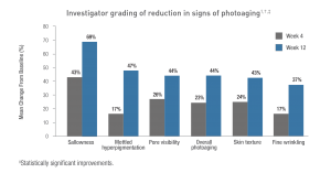 Fiecare semn de fotoîmbătrânire a fost evaluat subiectiv de investigator pe o scală cu șapte puncte (0-6) la fiecare moment dat; datele reprezintă diminuarea netă de la punctul de pornire pentru fiecare dintre semne.