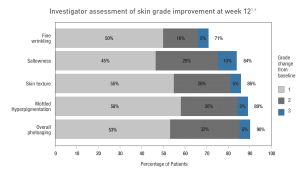 - Evaluarea investigatorului, procentual, a îmbunătățirilor la nivelul tenului, în săptămâna 12