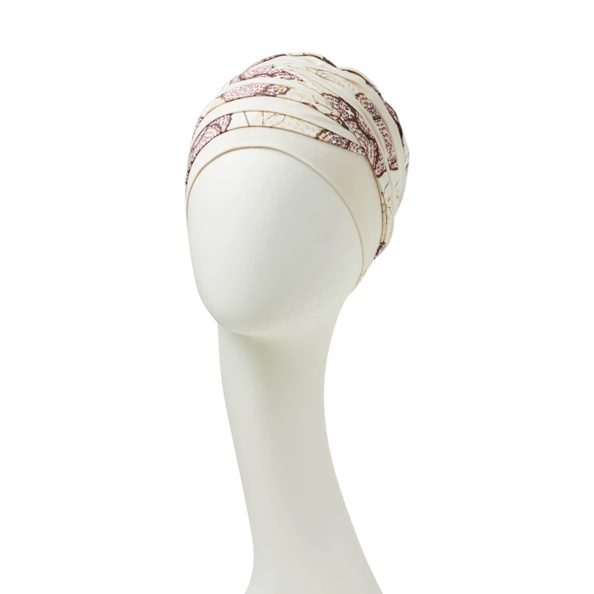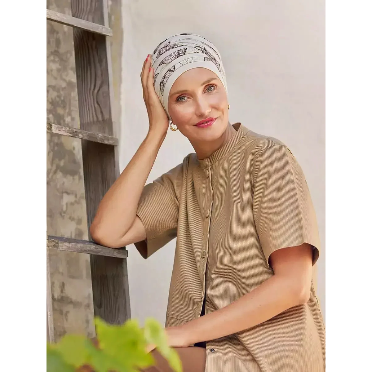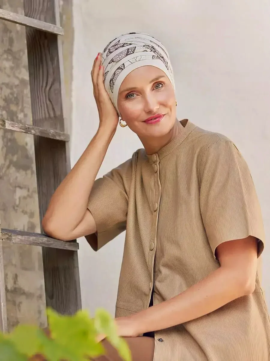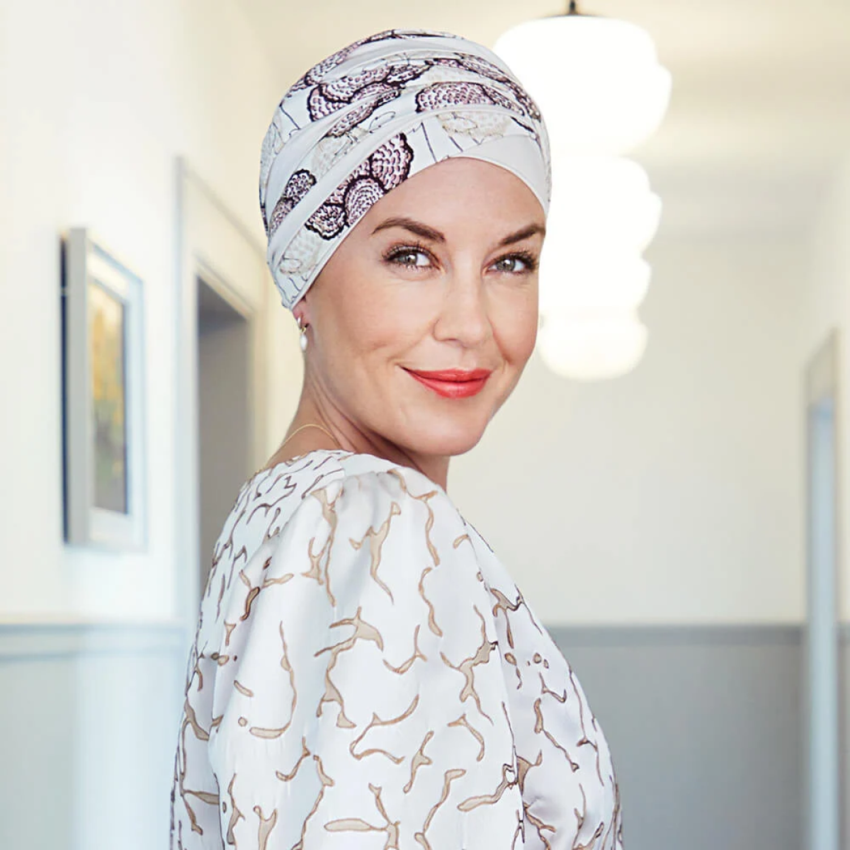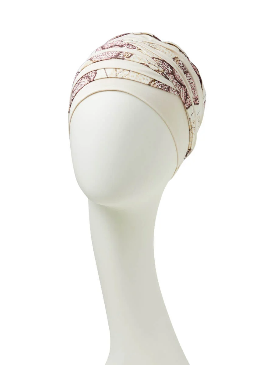 Turbanul Shanti este favoritul in colectia Christine, iar aici vine intr-o editie limitata. Shanti este realizat in frumosul imprimeu Blooming Pinks, cu straturile plisate de culoare crem care contrasteaza frumos. Dintr-un material natural, turbanul din bambus este lipsit de orice substante chimice si nu va irita pielea fragila dupa chimioterapie sau in cazul unui scalp cu par subtire si rar.