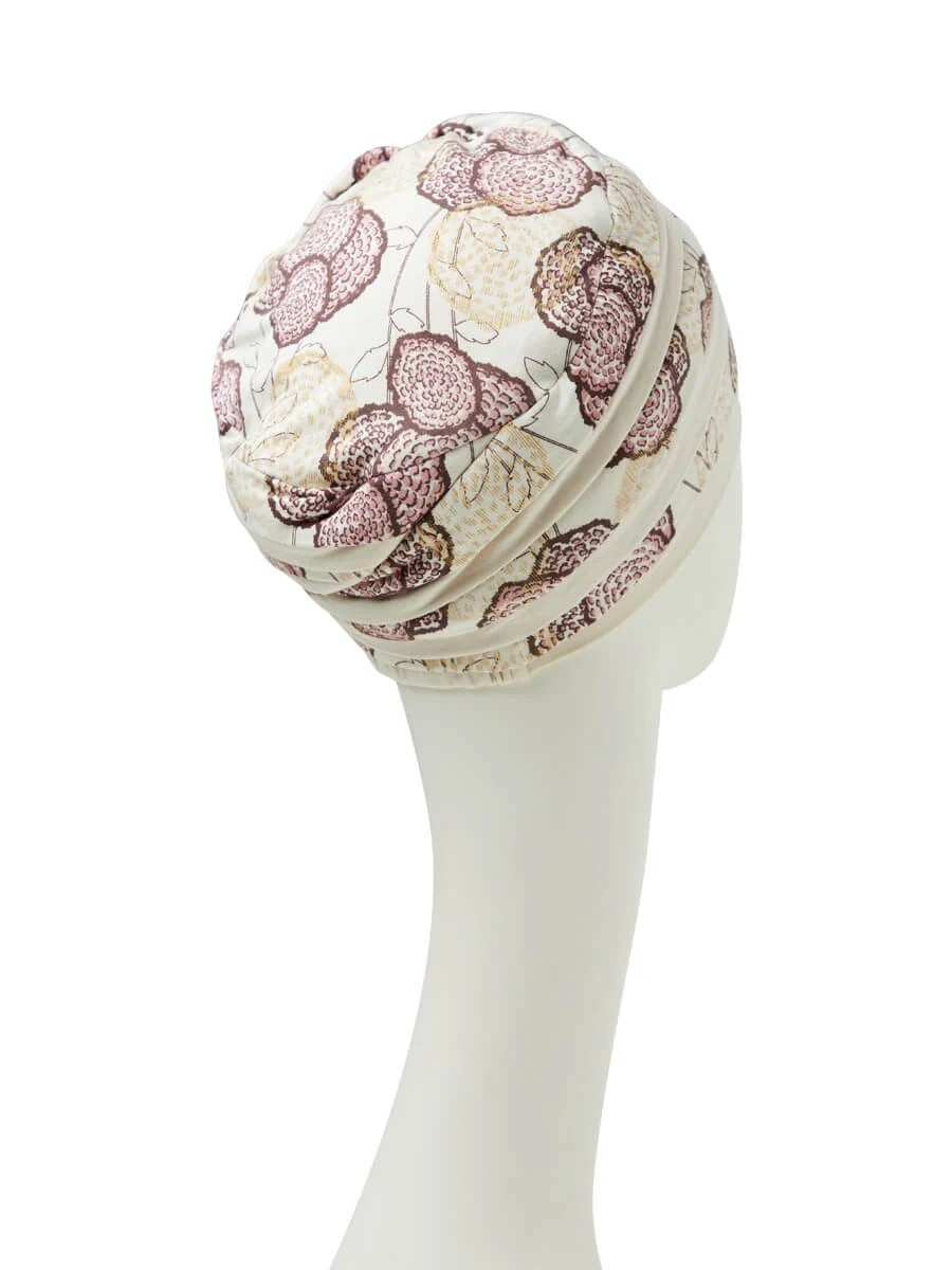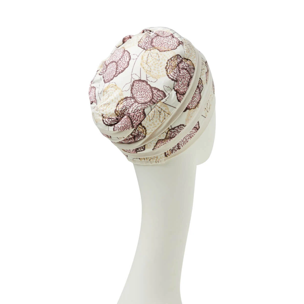 Shanti este realizat in frumosul imprimeu Blooming Pinks, cu straturile plisate de culoare crem care contrasteaza frumos. Modelul acesta are o caracteristica noua – tesatura imprimata si la spatele turbanului. Aceasta caracteristica aduce un aspect complet nou turbanului Shanti si, cu siguranta, va deveni un nou favorit.