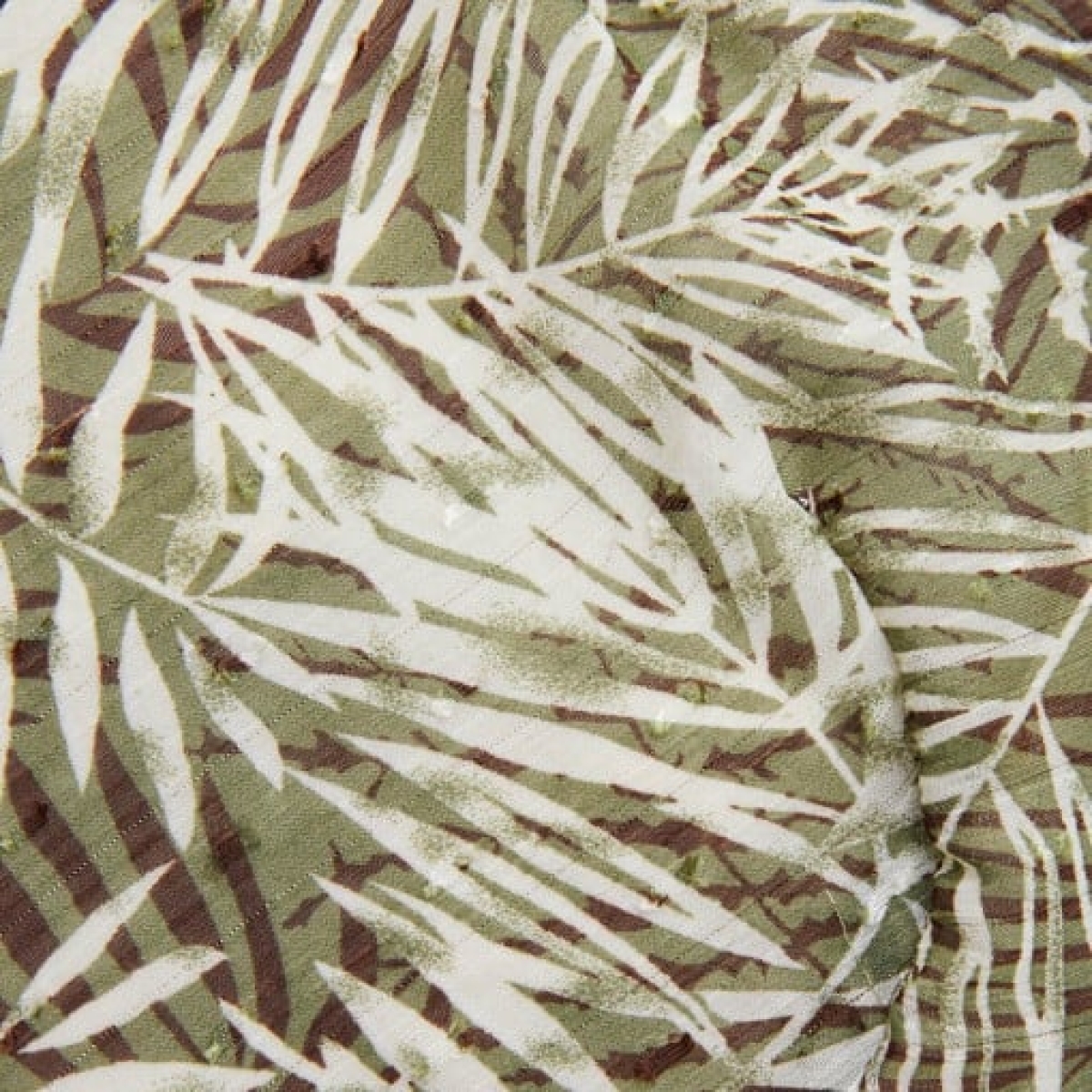 Verde, ca cea mai buna parte a primaverii, unde totul prinde viata si aduce zile luminoase si mai luminoase. Imprimeul pe acest frumos model este un ansamblu mixt de frunze de feriga verde, alba si maro inchis. tesatura este un sifon usor, cu o captuseala moale, alba, de viscoza moale de bambus. Un fir subtil verde-metalic trece prin tesatura de sifon adaugand un plus de farmec modelului.